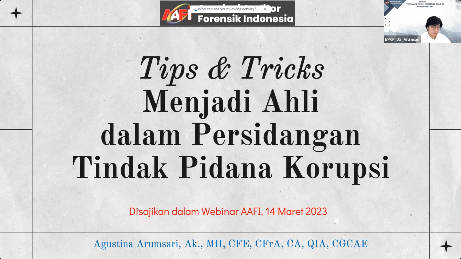 Terkait hal itu, AAFI WIRITLAK menggelar webinar bertajuk Tips and Tricks Menjadi Ahli di Persidangan yang menghadirkan Ibu Agustina Arumsari, Ak., M.H., CFE, CFrA, CA, QIA, CGCAE (Deputi Investigasi BPKP) sebagai Narasumber dan Ibu Dr. Selvia Vivi Devianti S.E., M.Sc., MCP., Ak, CFrA, CFE, CSFA (Direktur Litbang BPK RI) selaku Moderator.�