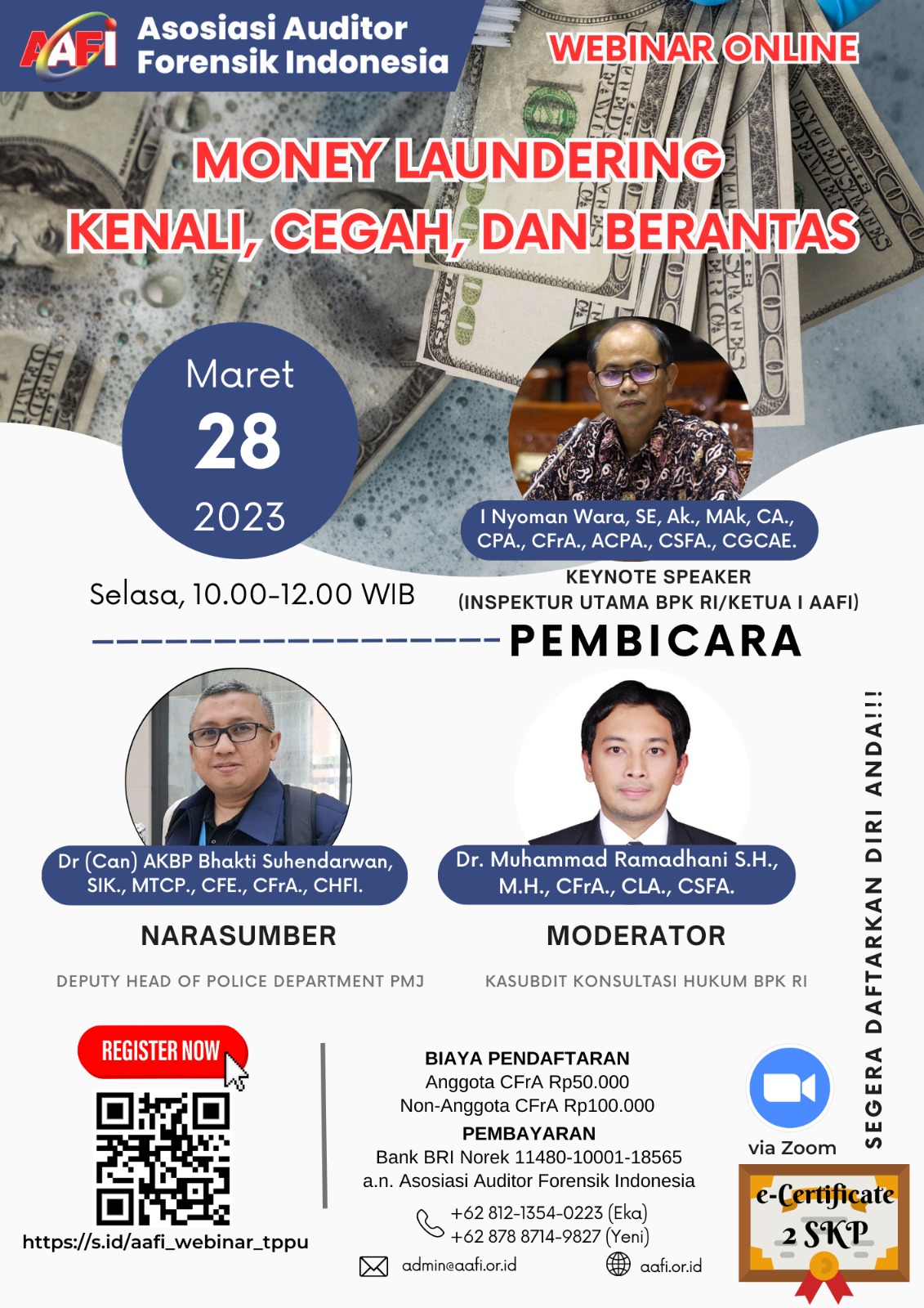 Asosiasi Forensik Auditor Indonesia (AAFI WIRITLAK) mengundang Bapak/Ibu dalam Webinar Online dengan Tema MONEY LAUNDERING, KENALI, CEGAH, DAN BERANTAS